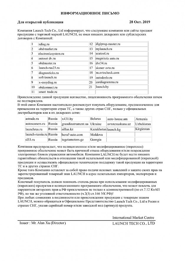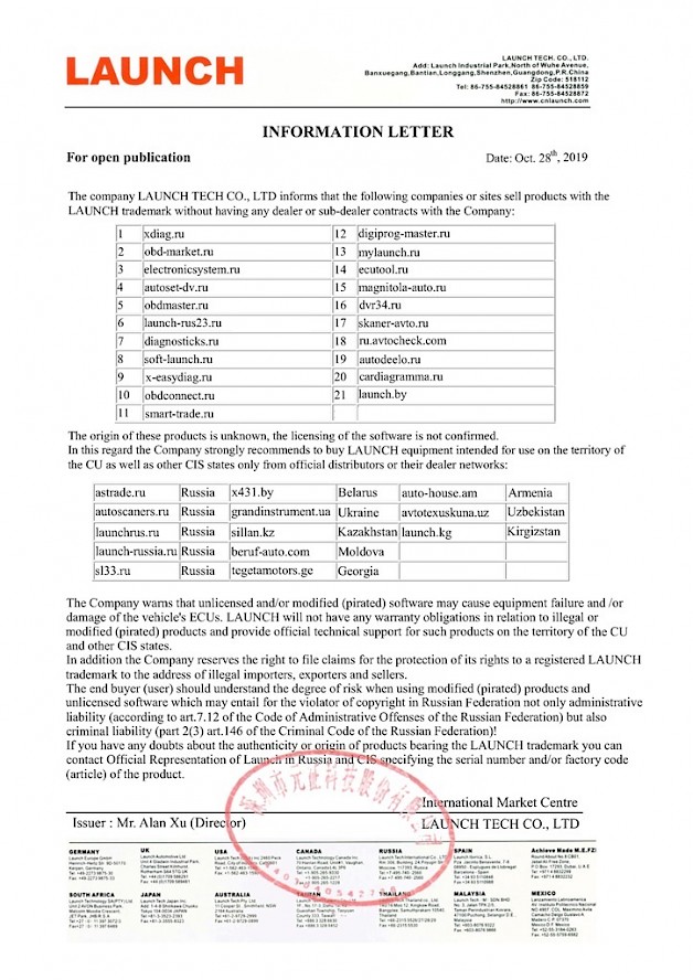 Головной офис (HQ) Компании LAUNCH доводит до общего сведения следующую важную информацию.